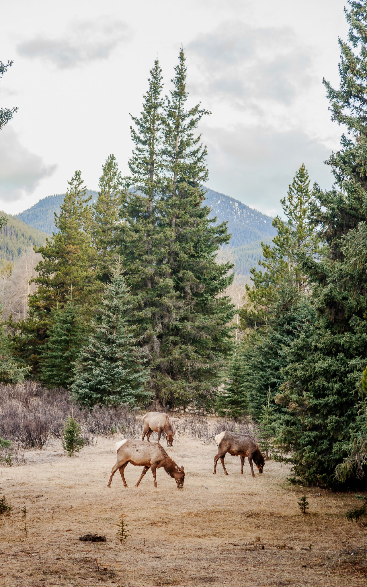 Wildlife roams freely, and elk are frequent visitors, often seen grazing at sunrise or silhouetted against the mountain skyline at dusk.