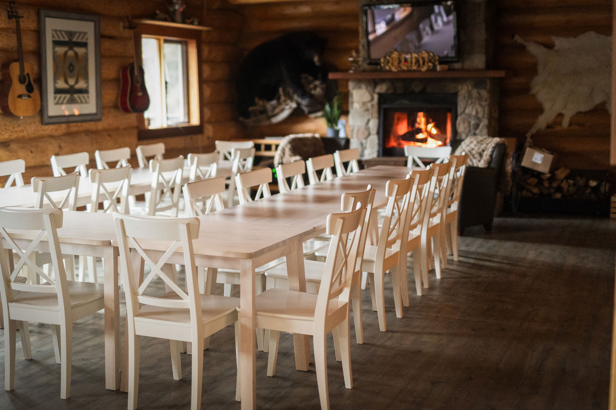 The main lodge blends rustic character with modern comfort. Warm wood interiors, panoramic windows, and cozy fireplaces create an inviting atmosphere for gatherings, retreats, and intimate celebrations.
